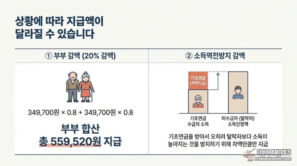 단독가구라면 감액 없이 기준연금액을 받을 수 있지만, 부부가구는 두 분 합산 약 55만 9천 원 정도를 받게 됩니다.