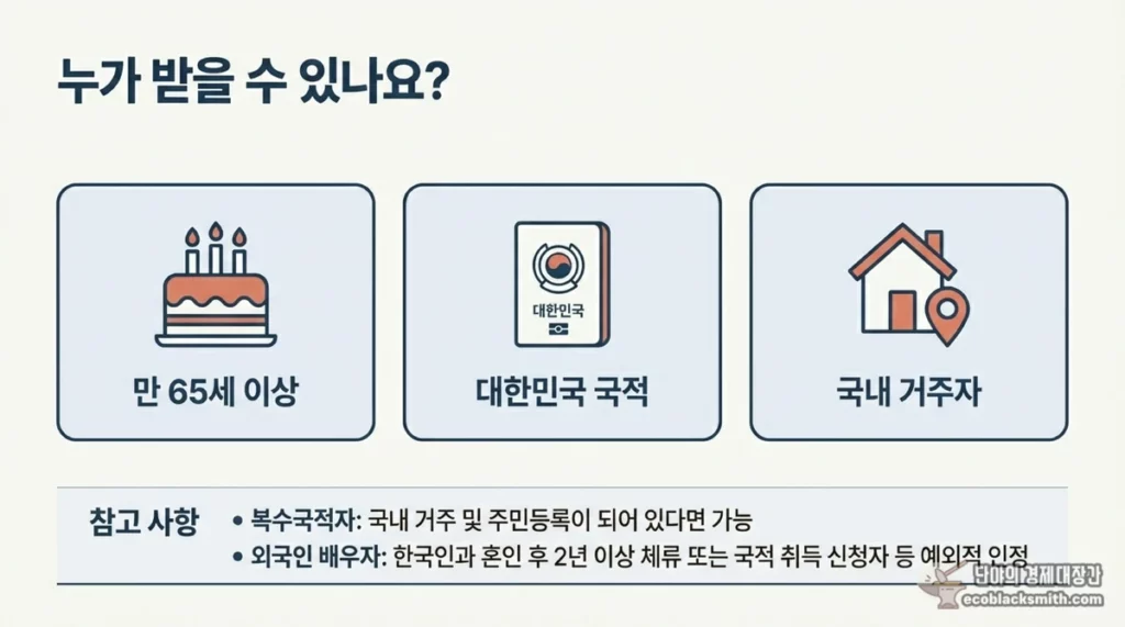 ✅ 기본 신청 자격 - 국적: 대한민국 국적 보유 - 연령: 만 65세 이상 - 주민등록: 국내 주민등록 필수