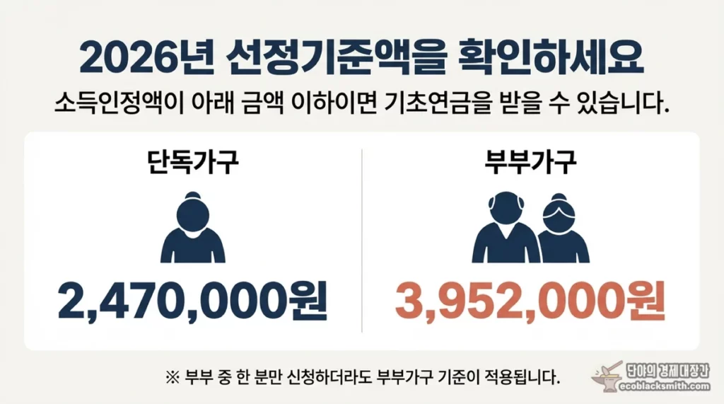 2026년 기초연금 선정기준액은 단독가구 247만 원, 부부가구 395만 2천 원입니다. 소득인정액이 이 금액 이하면 기초연금을 받을 수 있습니다.