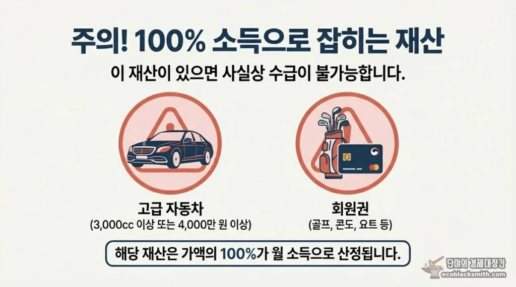 재산이 있더라도 지역별 기본재산액을 공제하고 소득으로 환산하기 때문에 바로 탈락하지는 않습니다. 대도시 기준 1억 3,500만원까지는 공제되고, 금융재산도 2천만원이 공제됩니다. 다만 4천만원 이상 고급자동차나 골프회원권 등은 전액 소득으로 환산되어 불리하게 작용합니다.