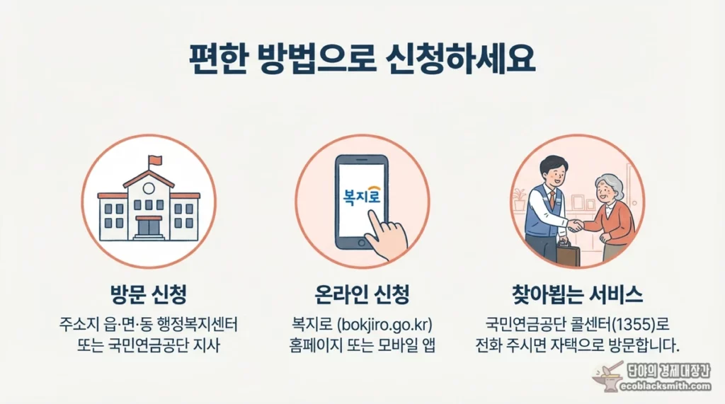 🏛️ 방문 신청 장소 - 전국 읍면동 주민센터(행정복지센터) - 국민연금공단 지사 - 찾아뵙는 서비스: 국민연금공단 고객센터 1355